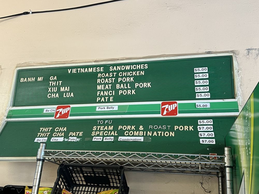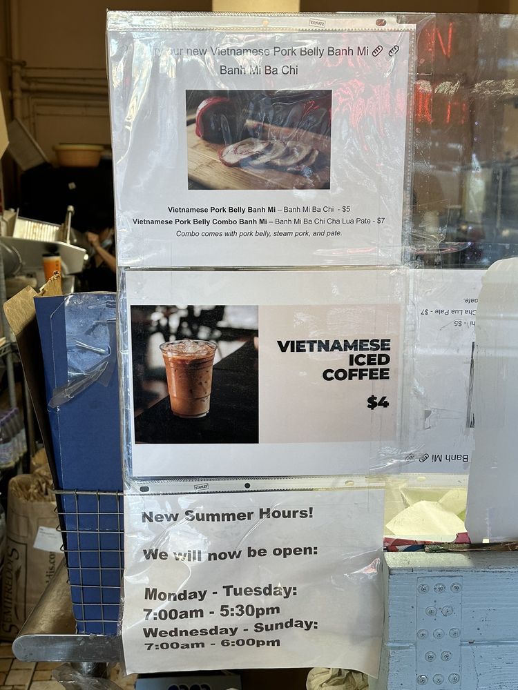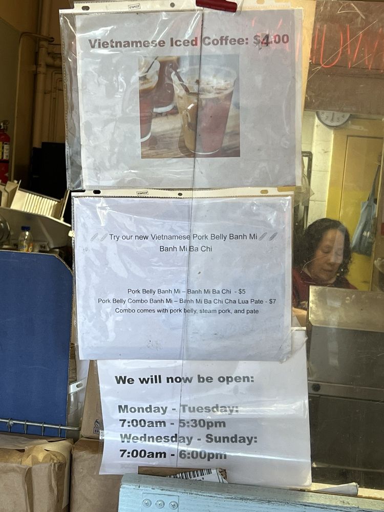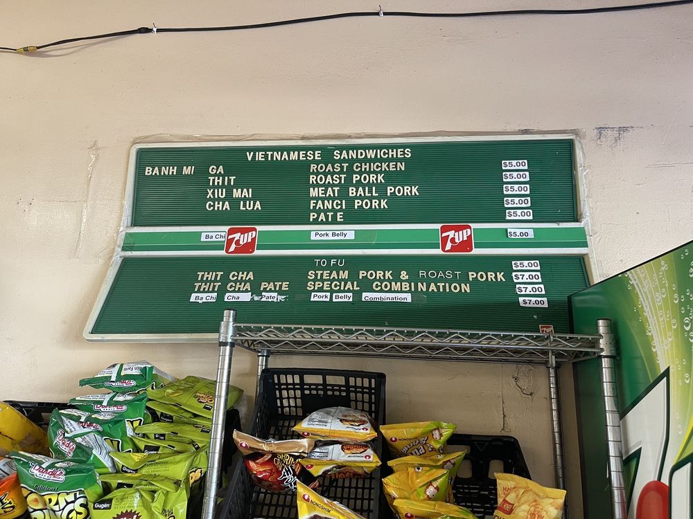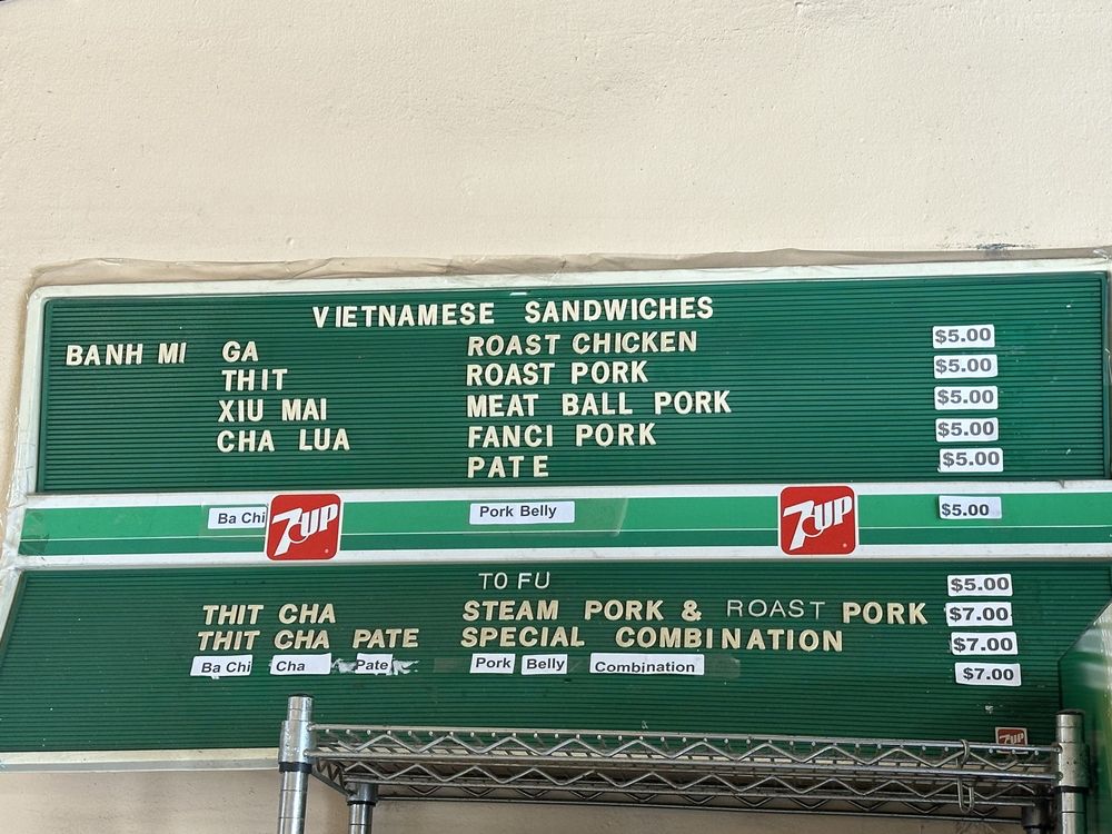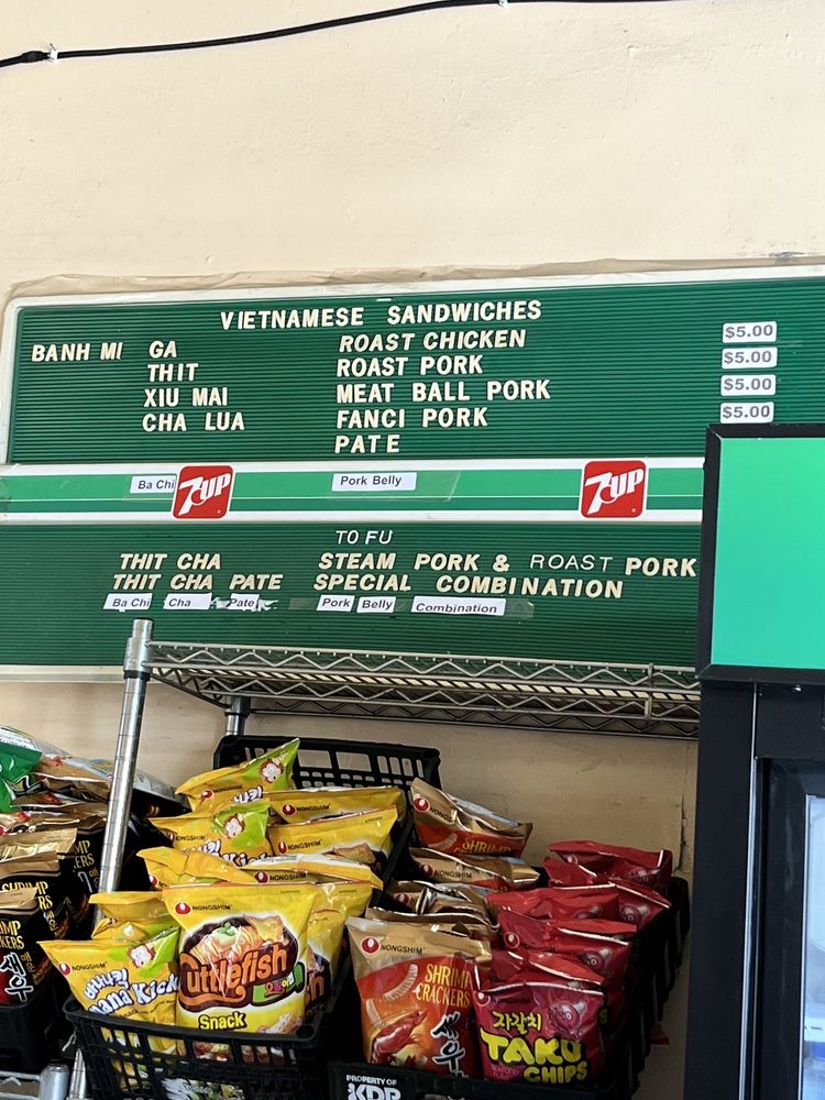 Introducing the menu at Saigon Sandwich, a Vietnamese sandwich shop in San Francisco's Little Saigon. Offering a variety of Banh Mi options such as Roast Chicken, Roast Pork, Meat Ball Pork, and Fanci Pork Pate, all priced at $4 each. Customers rave about the flavorful and value-packed sandwiches, praising the quick service and fresh ingredients. The cash-only policy adds to the authentic hole-in-the-wall experience. Don't miss out on their $4 iced Vietnamese coffees. With plastic-free packaging and a focus on sustainability, Saigon Sandwich stands out for its delicious offerings and efficient service. A must-visit for those craving affordable and tasty Vietnamese sandwiches in the heart of the city.
