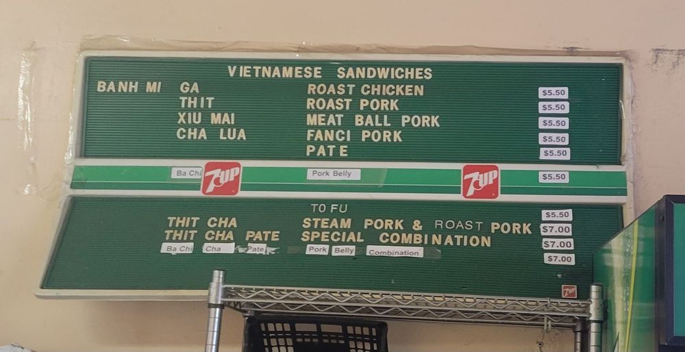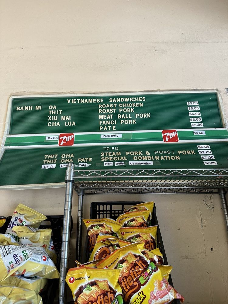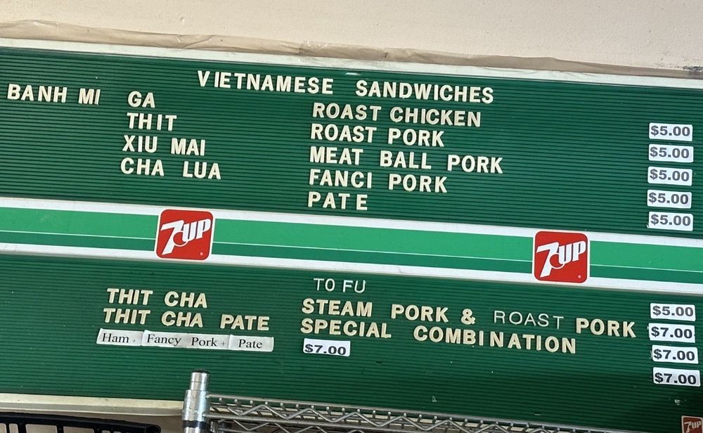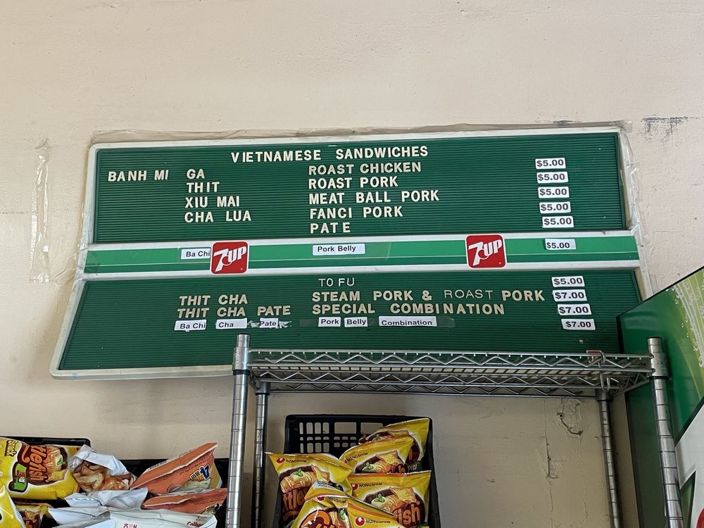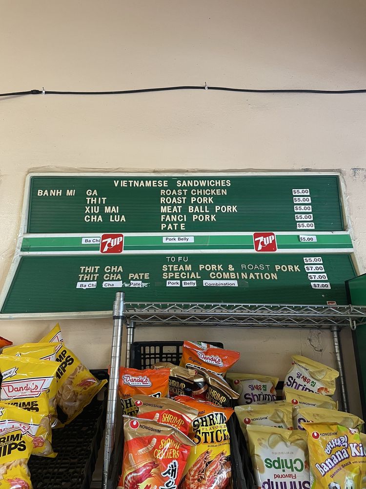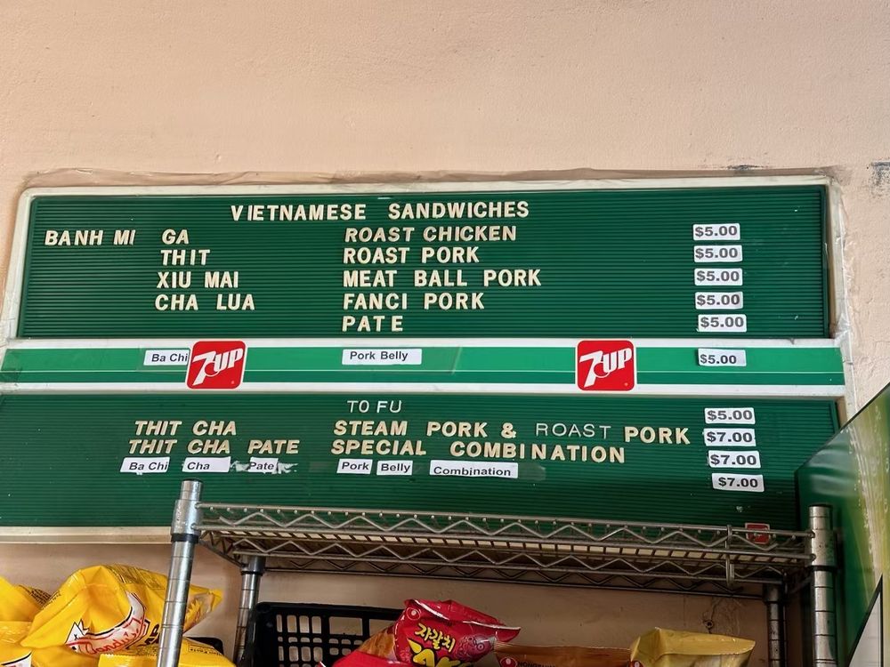 Introducing the menu at Saigon Sandwich, a Vietnamese sandwich shop in San Francisco's Little Saigon. Offering a variety of Banh Mi options such as Roast Chicken, Roast Pork, Meat Ball Pork, and Fanci Pork Pate, all priced at $4 each. Customers rave about the flavorful and value-packed sandwiches, praising the quick service and fresh ingredients. The cash-only policy adds to the authentic hole-in-the-wall experience. Don't miss out on their $4 iced Vietnamese coffees. With plastic-free packaging and a focus on sustainability, Saigon Sandwich stands out for its delicious offerings and efficient service. A must-visit for those craving affordable and tasty Vietnamese sandwiches in the heart of the city.